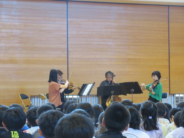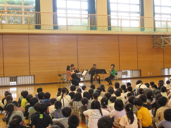 プライマリーコンサートが行われました。4名とは思えないほどの迫力のある演奏でした。最後に校歌を演奏してくださったので、みんなで一緒に歌うことができました。